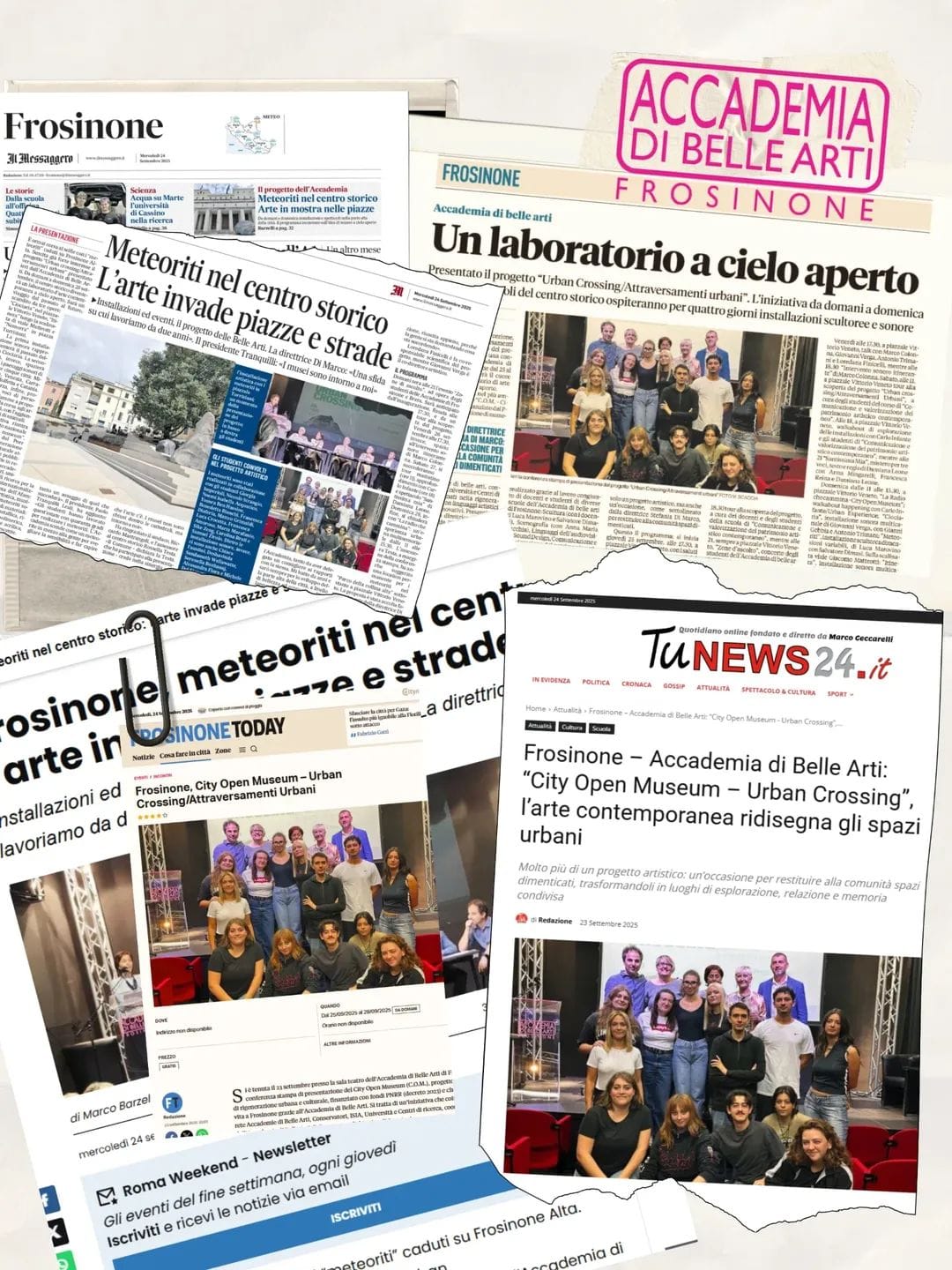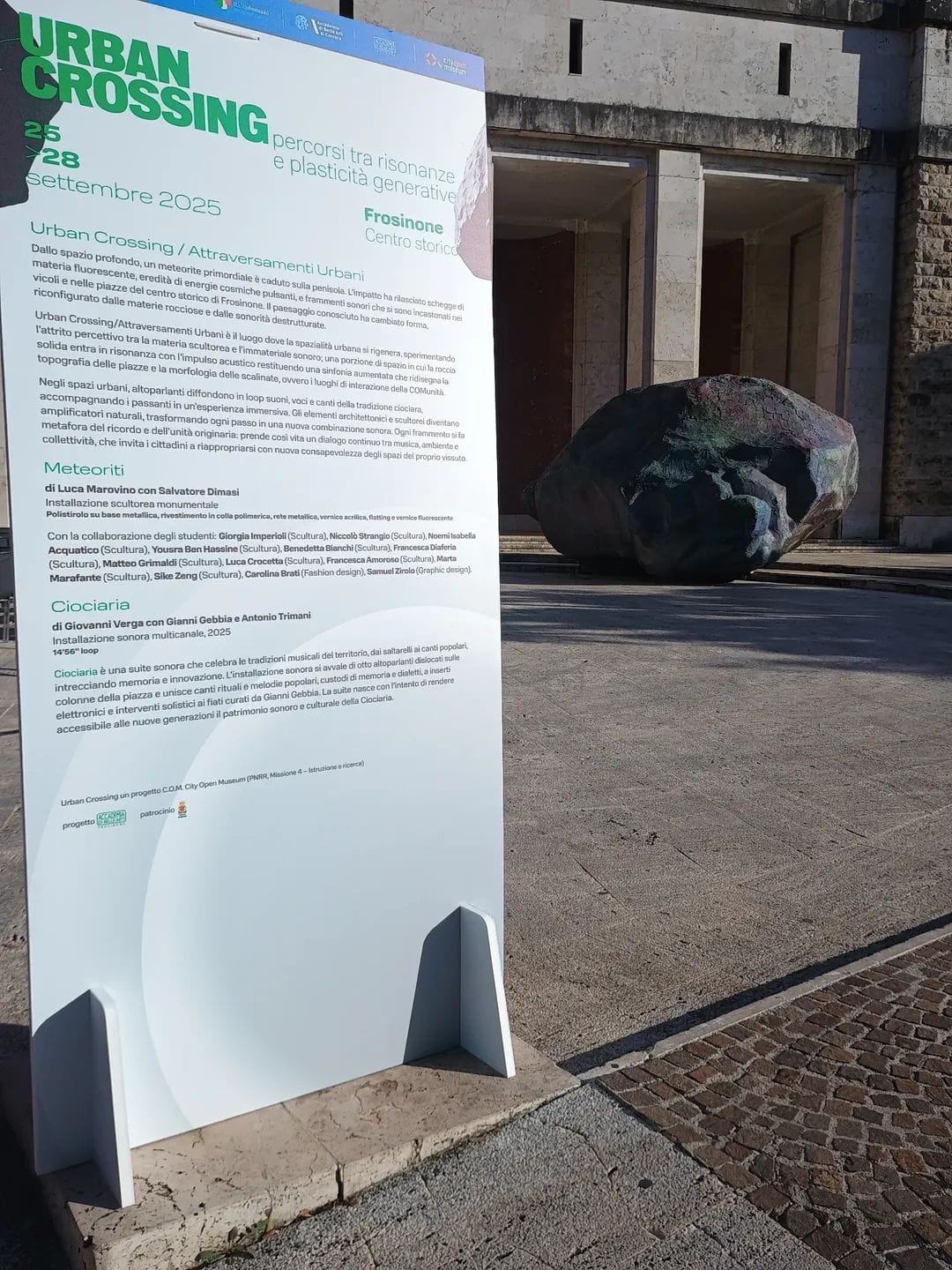 Al tramontare dell’estate ciociara, il centro storico di Frosinone ha visto un’alba nuova, trasformandosi in un laboratorio a cielo aperto. Cuore di questa metamorfosi è stato C.O.M, acronimo di City Open Museum con l’installazione Urban Crossing - Attraversamenti Urbani un progetto finanziato con fondi P.N.R.R., tenutosi in questa prima parte dal 25 al 28 ottobre 2025, e promosso dall’Accademia di Belle Arti di Frosinone in collaborazione con altri 18 istituti di formazione e ricerca italiani e con l’Accademia di Belle Arti di Carrara come ente capofila.