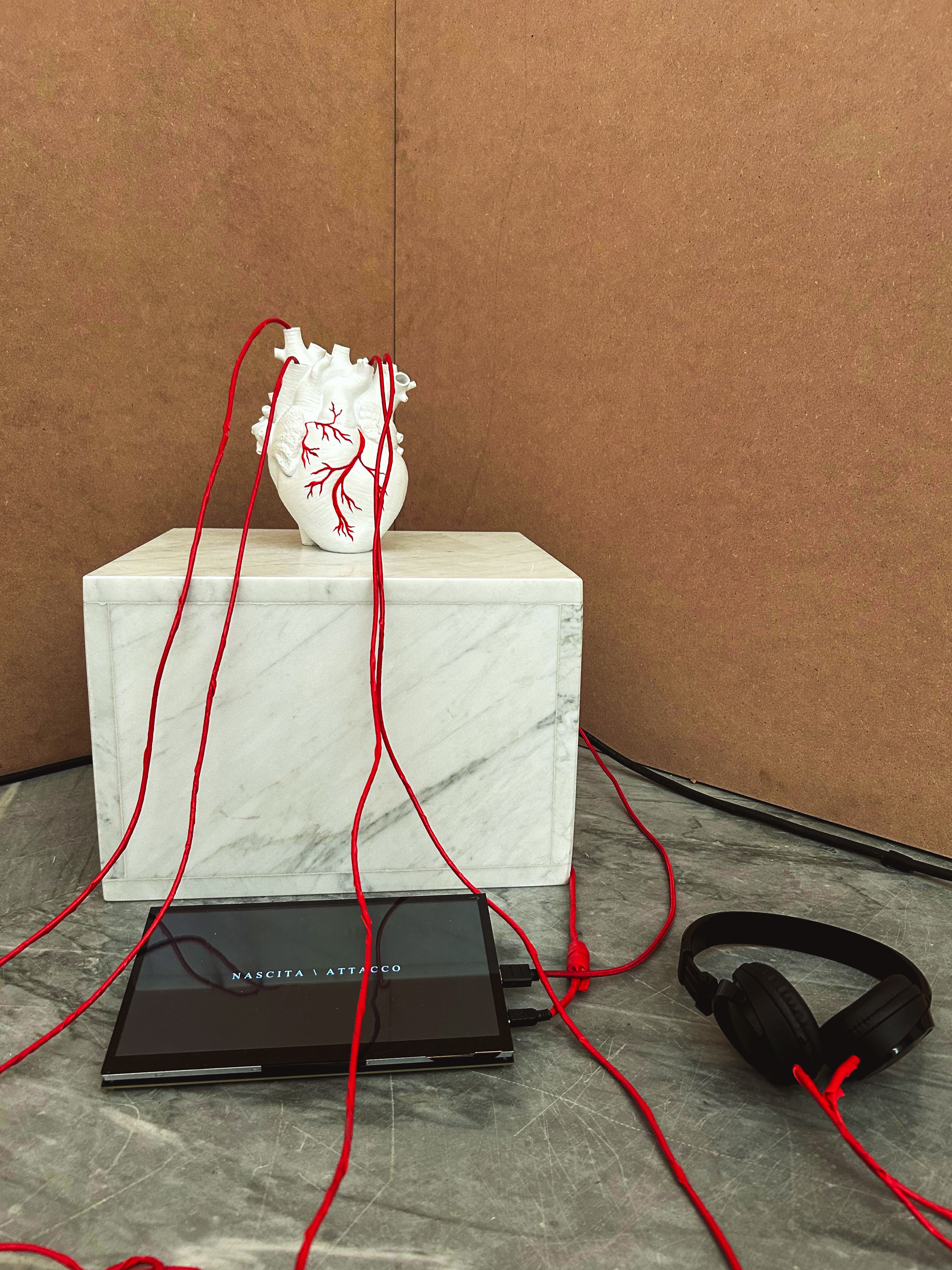 Cuore è un’installazione audio-visiva che si sviluppa come un flusso continuo di metamorfosi della vita di un cuore, individuale e astratto-universale, toccando le fasi dell’esistenza di ogni organismo: nascita, crescita, crisi, morte e rinascita. L’opera nasce dalla tesi di laurea di Serenella Bozhanaj sul paesaggio sonoro, che interpreta il suono come corpo mnemonico. Cuore si presenta come una scultura sonora ibrida che, tra arte classica e digitale, ricorda un epitaffio contemporaneo.
