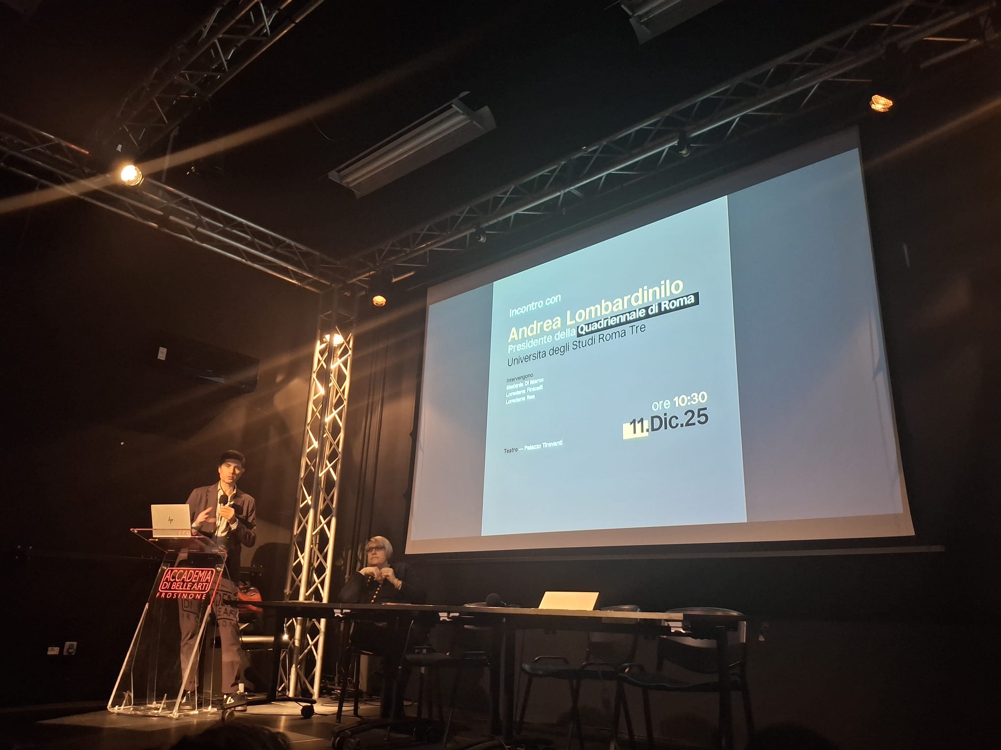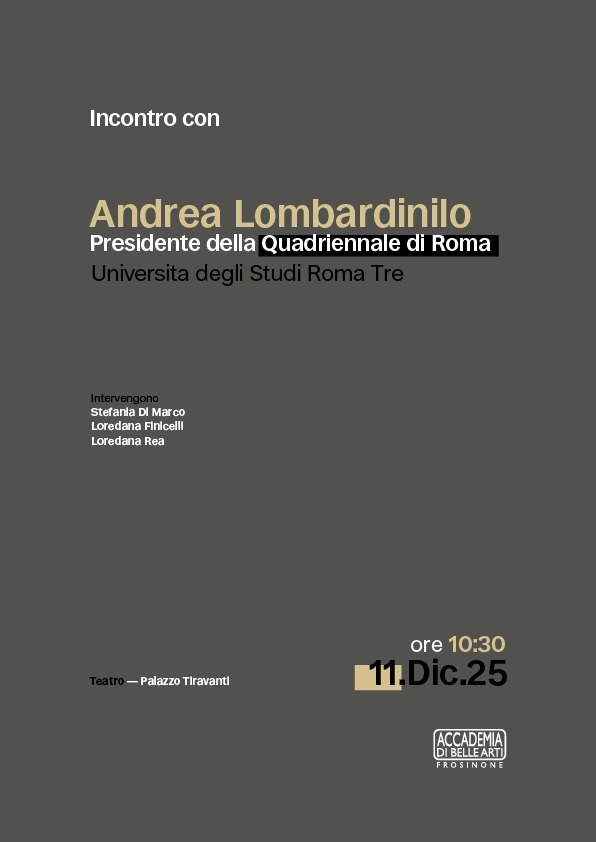 Giovedì 11 dicembre l’Accademia di Belle Arti di Frosinone ha ospitato il Presidente della Quadriennale Andrea Lombardinilo, introdotto dalla direttrice Stefania di Marco e in dialogo per tutta la durata dell’intervento con la professoressa Loredana Finicelli.