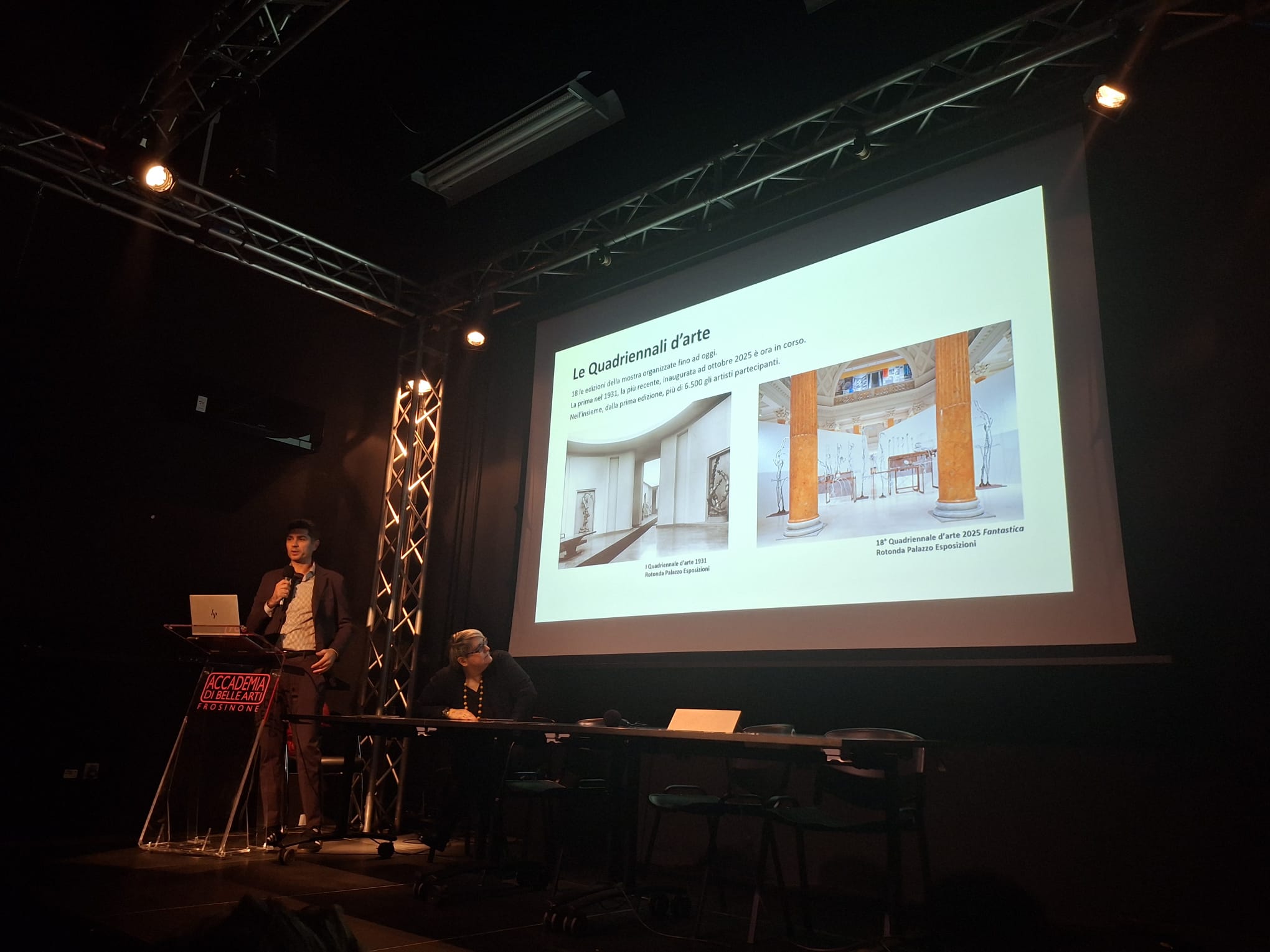 Andrea Lombardinilo ha illustrato la storia della Quadriennale di Roma, nata nel 1931 con l’ausilio di una serie di immagini d’epoca e video dell’Istituto Luce, quindi ha dato spazio alla edizione in corso, illustrandone le varie sezioni e i rispettivi curatori, introducendone i vincitori (Vedovamazzei) e individuandone nessi e tematiche culturali. La mostra di quest’anno in corso nella sua sede natura del Palazzo delle Esposizioni è stata ripetutamente visitata dai nostri studenti dell’Accademia e oggetto di domande e curiosità che sono state posta al Presidente, che, ricordiamo, è subentrato a seguito della scomparsa del suo predecessore Luca Beatrice, a cui si deve gran parte dell’impianto della Quadriennale in corso.