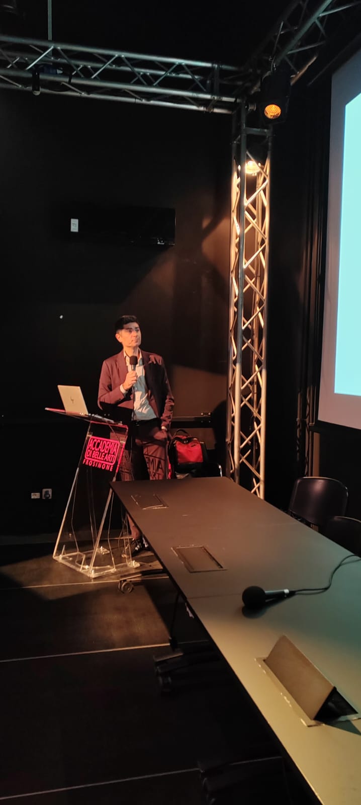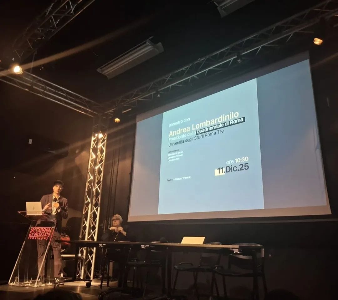 Andrea Lombardinilo, Presidente della Quadriennale di Roma, giovedì 11 dicembre, è stato ospite dell’Accademia di Belle Arti di Frosinone per un incontro, presso la Sala del Teatro, con docenti e studenti sul tema della 18° Quadriennale, uno dei principali appuntamenti espositivi nazionali, a cadenza appunto, quadriennale. Il professor Lombardinilo, associato di Sociologia per l’Università di Roma Tre, ha offerto una visione articolata delle origini dell’istituzione e del suo progressivo sviluppo, soffermandosi sul ruolo sempre più rilevante che la Quadriennale ha assunto nel coinvolgimento del pubblico e nel panorama culturale della capitale. Nata come istituzione dedicata alla valorizzazione dei giovani talenti, la Quadriennale è talvolta erroneamente percepita come una manifestazione legata al passato, pur presentando una selezione di opere contemporanee.