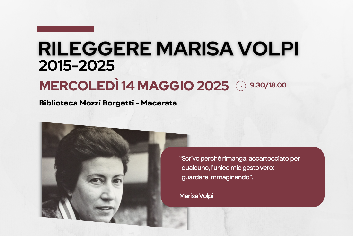 Il 14 maggio 2025, a 10 anni dalla scomparsa della scrittrice, critica e storica dell’arte Marisa Volpi (Macerata 1928-Roma 2015), si è svolta nella sua città natale la giornata “Rileggere Marisa Volpi. 2015-2025”, nella cornice della Biblioteca Mozzi Borgetti.